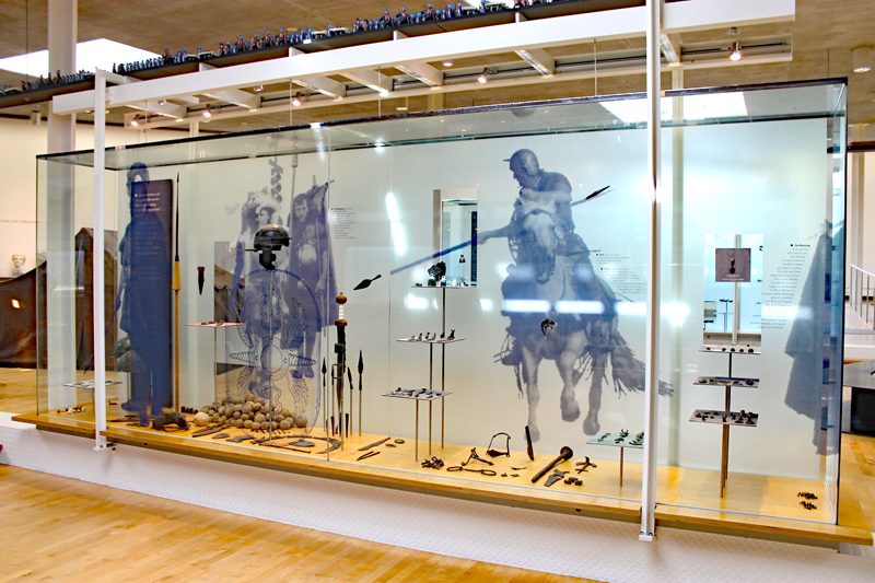 Wie heute in vielen Museen üblich, laden einige Bereiche zum Mitmachen ein. Mit dem schweren Marschgepäck eines Soldaten kann man beispielsweise durchs Museum wandern oder versuchen, mit dem Griffel Worte in das Wachs einer Schreibtafel zu ritzen.