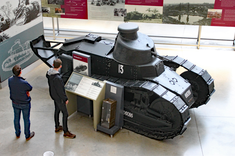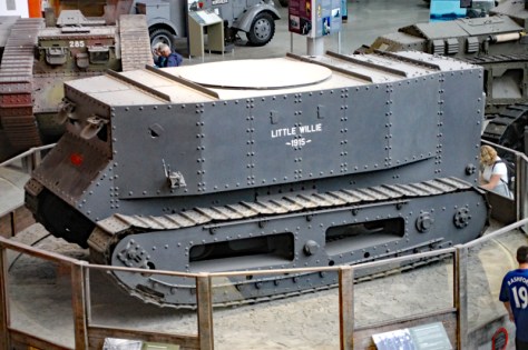 Erst im Ersten Weltkrieg wurde eine gepanzerte Maschine entwickelt, die auch wirklich im Kampf eingesetzt werden konnte. Auf Initiative des damaligen Marineministers Winston Churchill, der den ersten Panzerentwurf kurzerhand als Landschiff bezeichnete und dieser somit in sein Ressort fiel, wurde der Bau eines Prototypen vorangetrieben. Dieser Prototyp „Little Willie“, besser als „Mother“ bekannt ist der Ausgangspunkt der Ausstellung und der erste Panzer überhaupt.