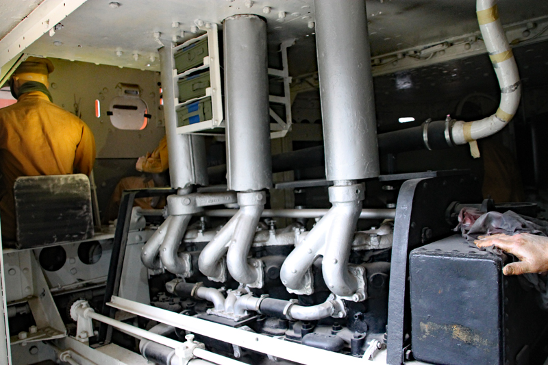 Der 6-Zylinder Daimler (gemeint ist hier die Daimler Motor Company in Coventry) Motor mit 106 PS befand sich mitten im Inneren des Panzers, also in einem Raum zusammen mit der Besatzung!