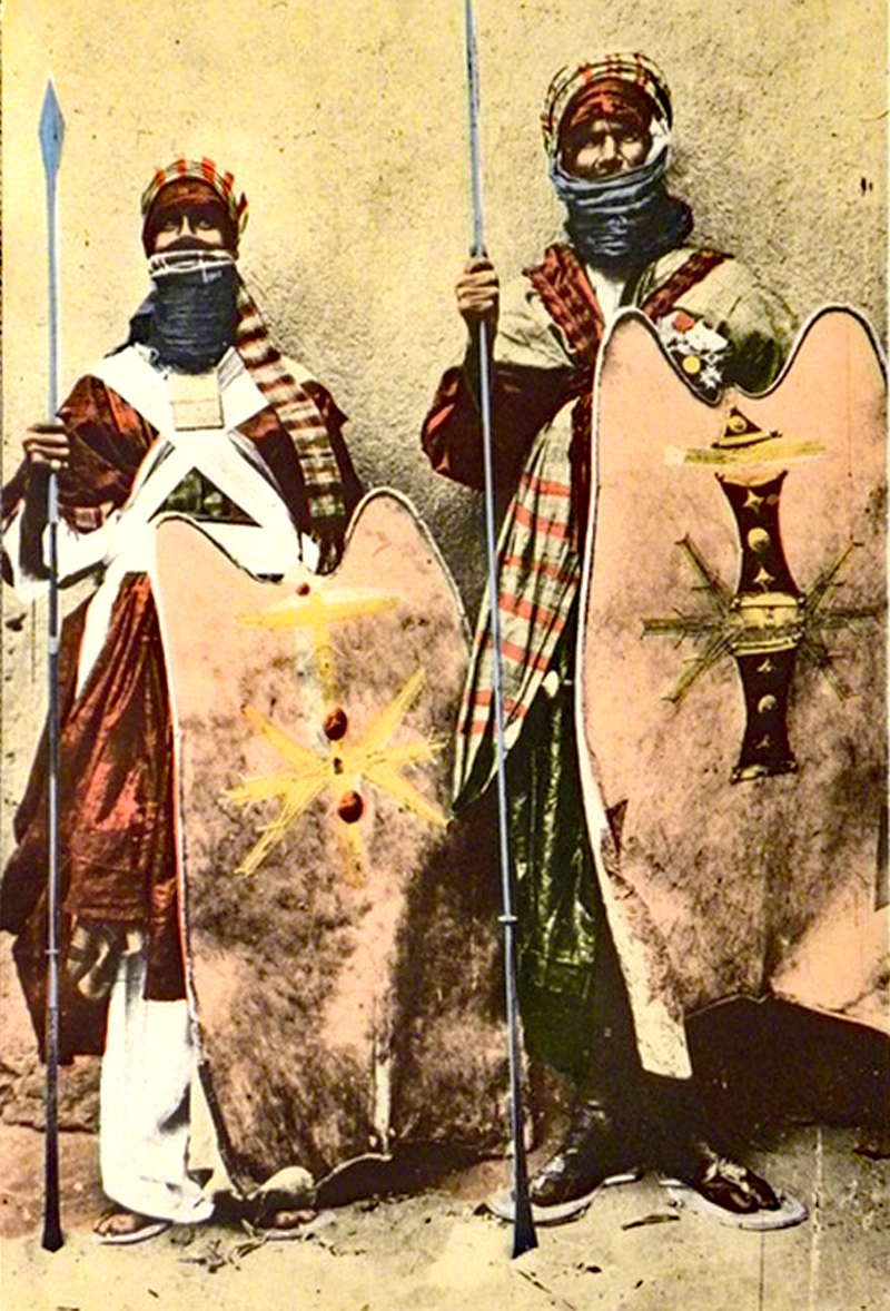 Ich habe allerdings gelesen, dass Korangelehrte oft ein weißes Tuch am Stirnbereich getragen haben. Es könnte also sein, dass diese Kombination mit weißem Stoff nur für diese Gruppe zutraf. Über die Brust verliefen außerdem häufig zwei gekreuzte Tücher oder so eine Art Bandelier. Es mag aber sein, dass es sich bei der Kleidung auf den alten Abbildungen um eine Art Festtagskleidung handelt und nur zu besonderen Anlässen getragen wurde. Man kann sich vorstellen, dass die Tuareg auf den Fotos sich extra für die Kamera herausgeputzt hatten.