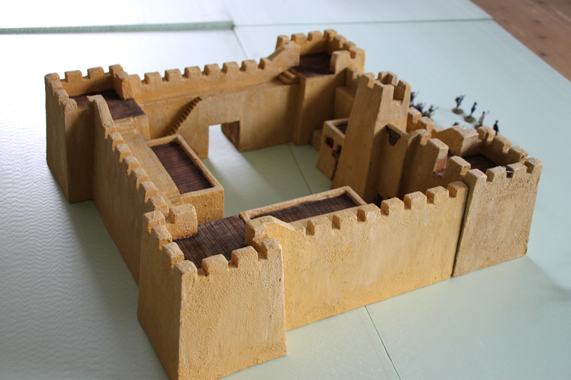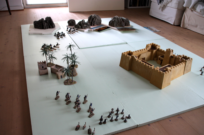 Dreht und Angelpunkt ist aber das Wüstenfort, dass auf der Platte stehen soll. Hier greifen wir auf das alte Fort „Zinderneuf“ von Hudson and Allen zurück, dass schon mehr als 10 Jahre im Besitz von Björn ist. Auch Palmen und kleine Gebäude sind schon fertig. Es geht also zunächst darum, die Spielplatte anzufertigen und noch einige Figuren zu bemalen.