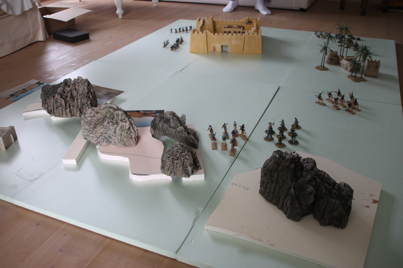 Bei einer ersten Stellprobe haben wir entschieden, dass die neue Spielplatte ca. 180 x 240 cm groß sein soll. Geplant ist ein Gebirgszug, der die Hoggar-Berge darstellt, eine kleine Oase und ein Wüstenfort am Rande von großen Sanddünen.