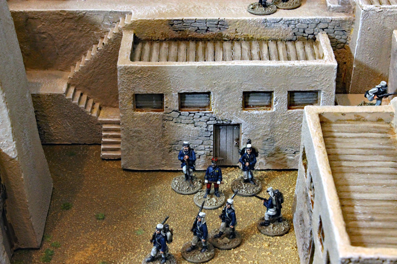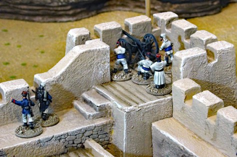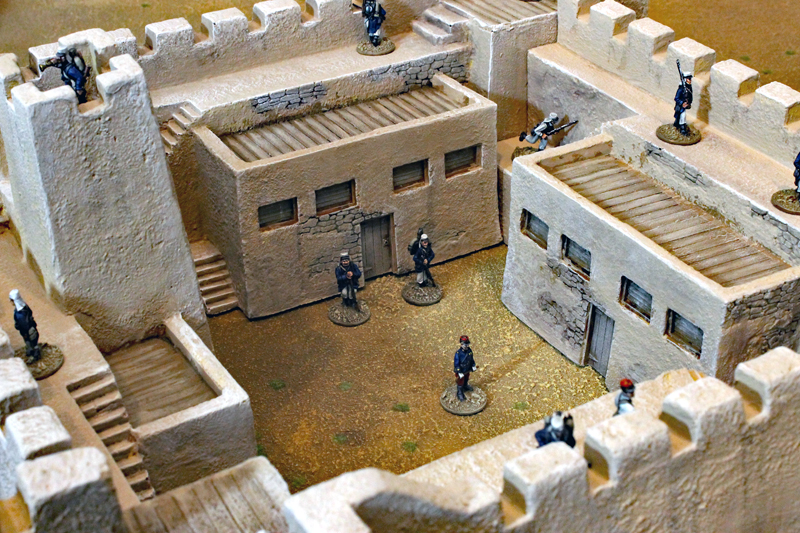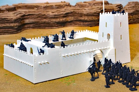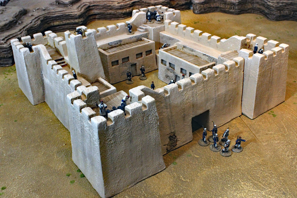 Ein 28mm Modell des Film-Forts gibt es glücklicherweise von der Firma Hudson and Allen. Björn hat das gute Stück schon seit längerem in seinem Besitz, nun wurde es aber noch einmal neu bemalt. Das Fort hat einen quadratischen Grundriss mit hohe, Zinnen bewehrten Mauern und Bastionen. Im Inneren des Forts befinden sich zwei Baracken und ein Magazin, sowie ein Beobachtungsturm. Die Laufgänge der Mauern sind durch mehrere Treppenaufgänge zu erreichen. Natürlich darf auch ein Tor nicht fehlen.
