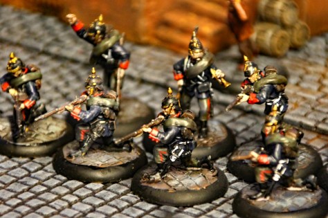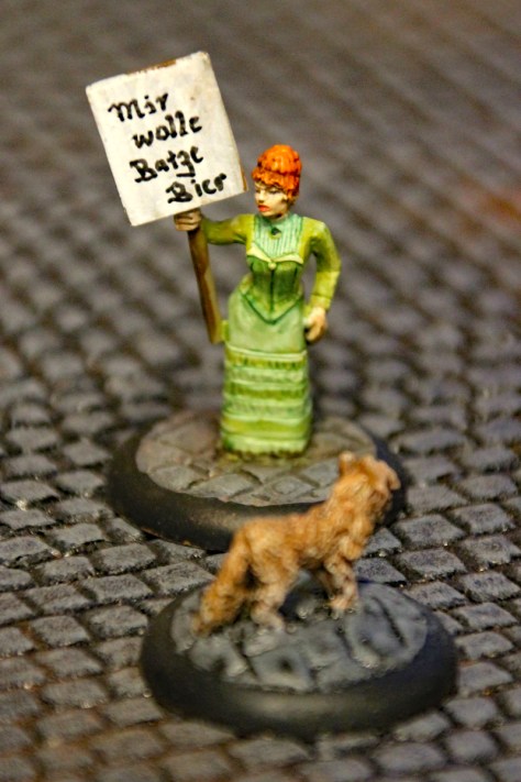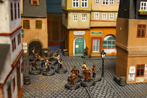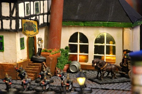 Mit der Forderung „Wir wolle Batzebier“ waren Sebastian und Martin mit dem ungewöhnlichen Szenario rund um den sogenannten Frankfurter Bierkrawall von 1873 angereist. Der Tabletop Club Rhein Main e.V. hat mit ihren Frankfurter Häusern ein sehr stimmungsvolles Bild dieser skurrilen Geschichte auf die Spielplatte gezaubert. Das Ganze war außerdem auch noch beleuchtet und einer der Mitwirkenden hat sogar ein eigenes Bier für die Präsentation gebraut. Ich war und bin sehr begeistert und das Bier war übrigens auch noch extrem lecker!