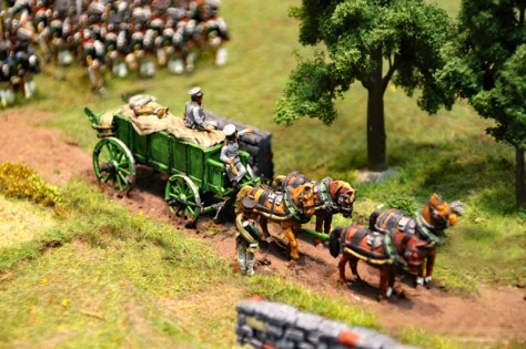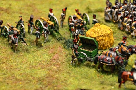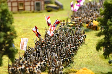 Dirk und Karl-Heinrich von der „Berliner Napo Runde“ hatten mal wieder einen beeindruckenden Spieltisch mit den von Ihnen gewohnten Massen an Figuren am Start. Toll waren für mich die vielen dekorativen Fahrzeuge und Wagen, die das Ganze wie ein Diorama erscheinen ließen. Man muss mal erwähnen, dass jedes Jahr eine neue Spielmatte und ein Großteil der Figuren extra für die TACTICA vorbereitet werden. In dem präsentierten Black-Powder Szenario standen die sächsischen Truppen in der Völkerschlacht bei Leipzig im Jahr 1813 im Mittelpunkt des Geschehens.