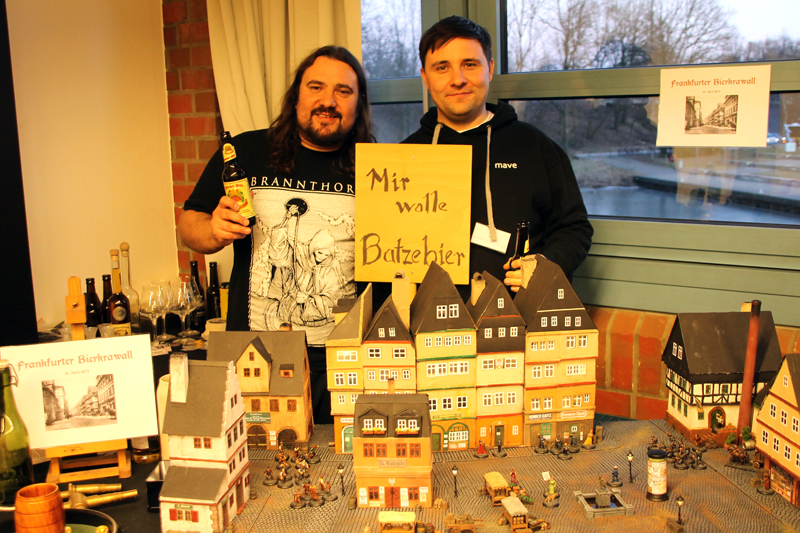 Mit der Forderung „Wir wolle Batzebier“ waren Sebastian und Martin mit dem ungewöhnlichen Szenario rund um den sogenannten Frankfurter Bierkrawall von 1873 angereist. Der Tabletop Club Rhein Main e.V. hat mit ihren Frankfurter Häusern ein sehr stimmungsvolles Bild dieser skurrilen Geschichte auf die Spielplatte gezaubert. Das Ganze war außerdem auch noch beleuchtet und einer der Mitwirkenden hat sogar ein eigenes Bier für die Präsentation gebraut. Ich war und bin sehr begeistert und das Bier war übrigens auch noch extrem lecker!