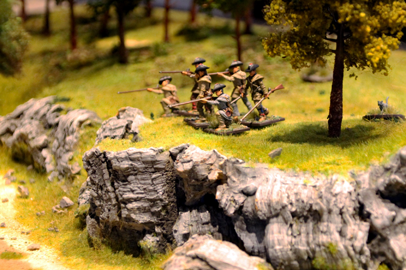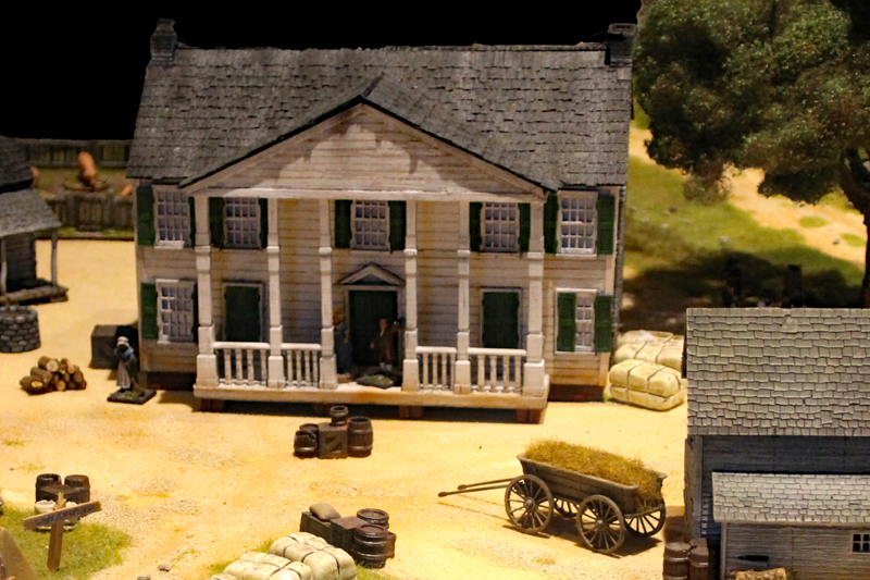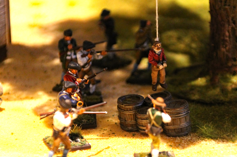Auch bei dieser Spielplatte waren echte Meister des Geländebaus am Werk. Neben vielen sensationellen Details fielen dem flüchtigen Betrachter natürlich zuerst die Baumwollfelder und das pompöse „Farmhaus“ als Highlights ins Auge. Gespielt wurde übrigens nach dem Regelwerk Musket & Tomahawks. Das Szenario war natürlich im amerikanische Unabhängigkeitskrieg angesiedelt, wo 1780 der berüchtigte Partisanenführer Francis „Swamp Fox“ Marion den Engländern das Leben schwermachte. Um seinen Überfällen ein Ende zu setzen, beauftragten die Briten Banastre „Bloody Ban“ Tarleton mit seiner gefürchteten British Legion, um den „Sumpf-Fuchs“ zur Strecke zu bringen. Einen tosenden Applaus für Tabletop Sachsen und Tabletopclub Dresden e.V., die diese sensationelle Präsentation gestaltet haben.