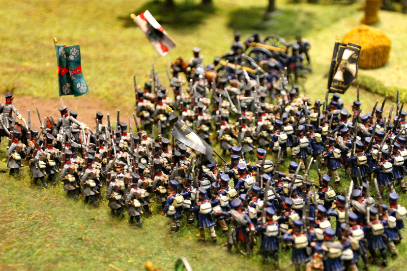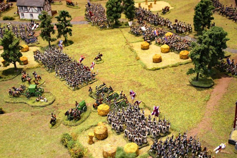 Dirk und Karl-Heinrich von der „Berliner Napo Runde“ hatten mal wieder einen beeindruckenden Spieltisch mit den von Ihnen gewohnten Massen an Figuren am Start. Toll waren für mich die vielen dekorativen Fahrzeuge und Wagen, die das Ganze wie ein Diorama erscheinen ließen. Man muss mal erwähnen, dass jedes Jahr eine neue Spielmatte und ein Großteil der Figuren extra für die TACTICA vorbereitet werden. In dem präsentierten Black-Powder Szenario standen die sächsischen Truppen in der Völkerschlacht bei Leipzig im Jahr 1813 im Mittelpunkt des Geschehens.