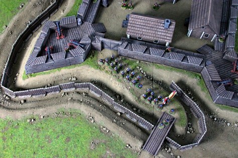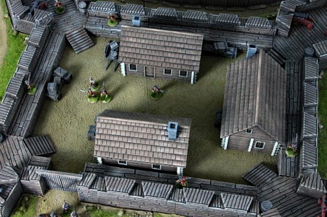 Nun ging es an die Bemalung des Forts und der Palisade. Nach dem Auftragen des Grundtons wurden alle Teile mit schwarzbrauner, stark verdünnter Farbe gewasht und abschließend trockengebürstet. Die Platte ist jetzt mehr oder weniger fertig. Es fehlen noch einige Details, wie das Bemalen der Steine und das Aufbringen von hohen Grasbüscheln. Am letzten Wochenende konnte ich auch schon zwei erste Testspiele mit Björn bestreiten. Es sind ja nur noch zwei Wochen bis zur Do or Dice, ich muss also noch etwas Gas geben.