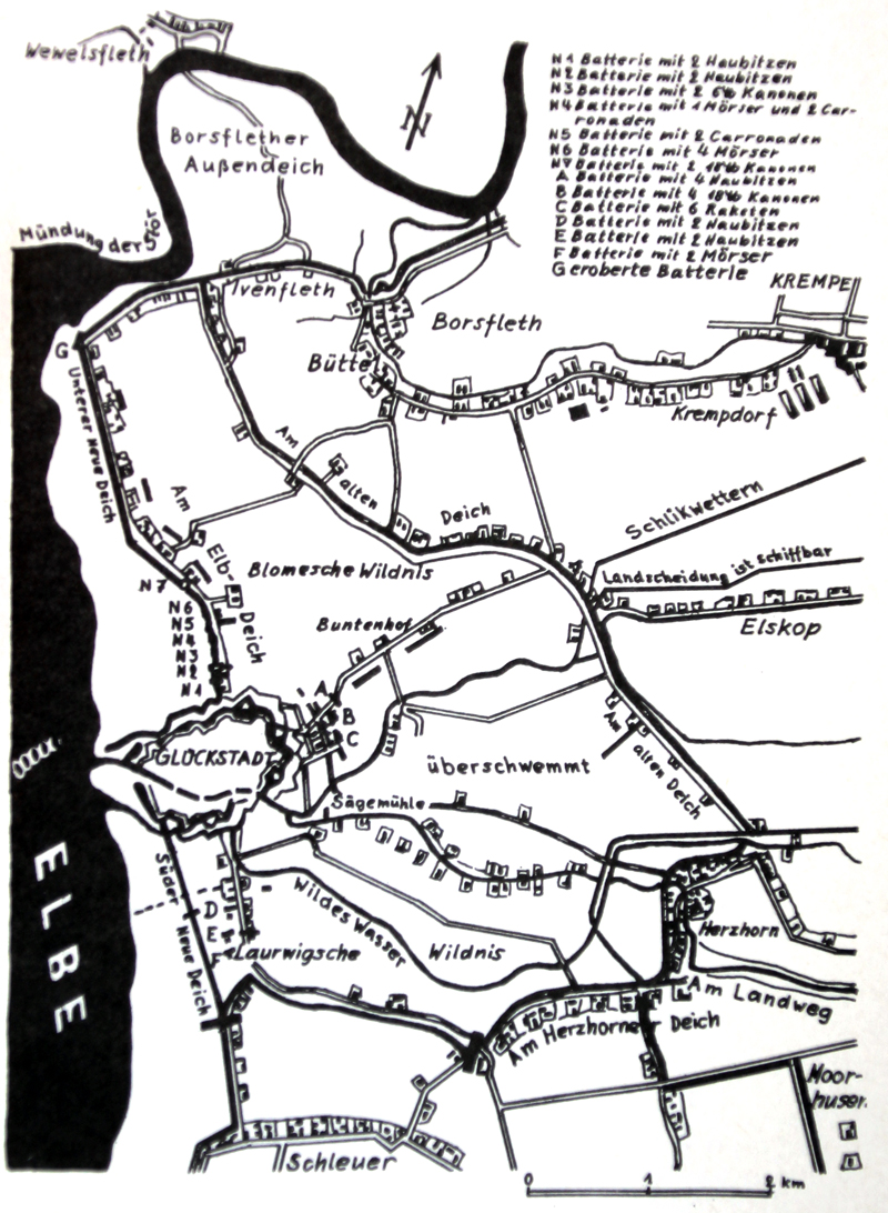 Die Gegend rund um Glückstadt und die Position der Belagerungs-Batterien.