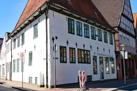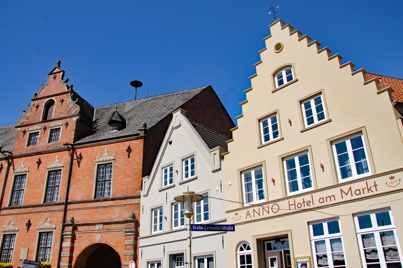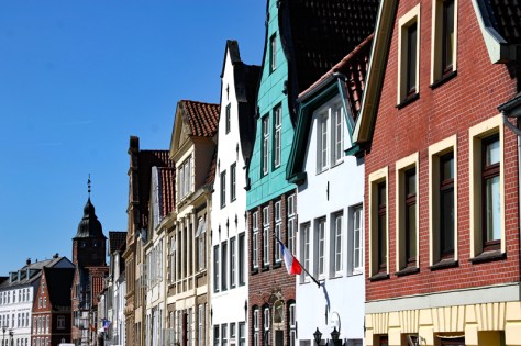 Neben dem Rathaus von Glückstadt stehen einige schöne alte Häuser, die ebenfalls noch eingemauerte Kanonenkugeln in ihren Giebeln aufweisen.