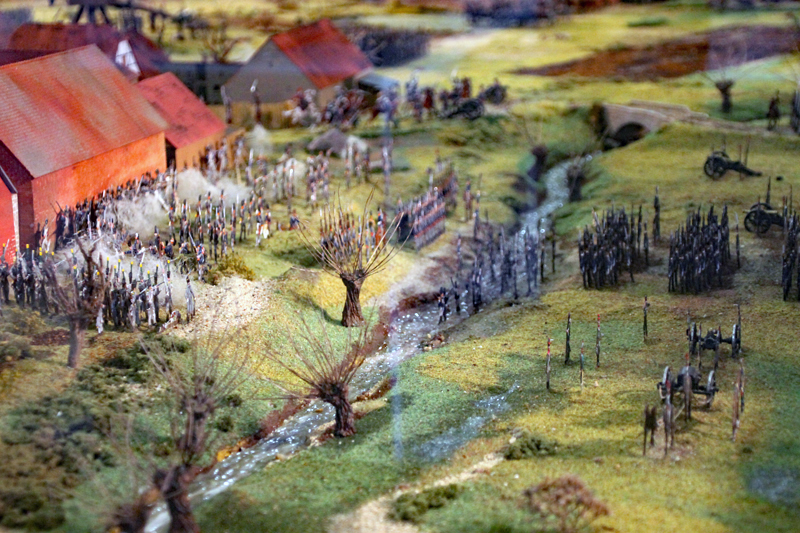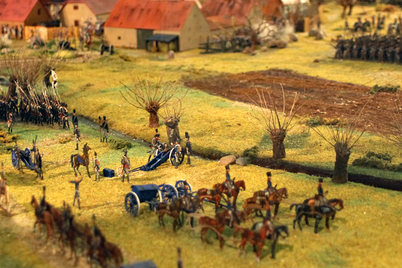 Rechts davon ist das Pommersche Grenadier-Bataillon bei der Durchquerung der Ehle, um dem Füsilier-Bataillon des 4. Ostpreußischem Infanterie-Regimentes Umstürzung im Kampf um die Gärten zu geben, die von den Voltigeuren des neapolitanischem Eliten-Bataillons und den Grenadieren und Füsilieren der 112. Französischen-Linien-Infanterie verteidigt werden.