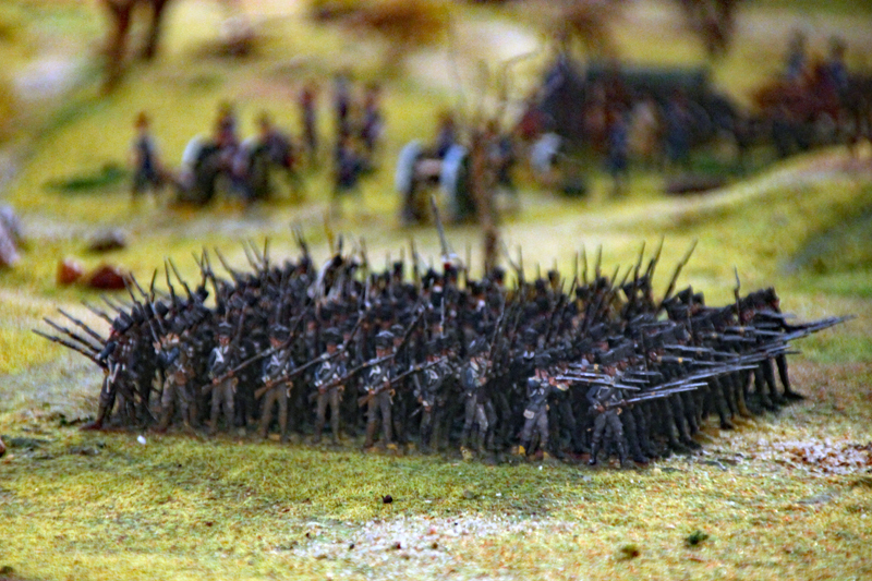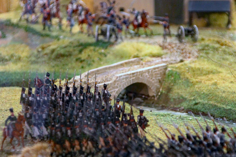 Im Zentrum marschiert ein Bataillon des 26. Russischen Jäger-Regiments auf die Ehle-Brücke zu.