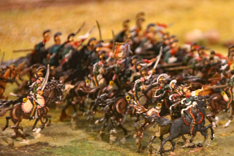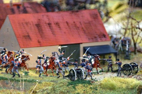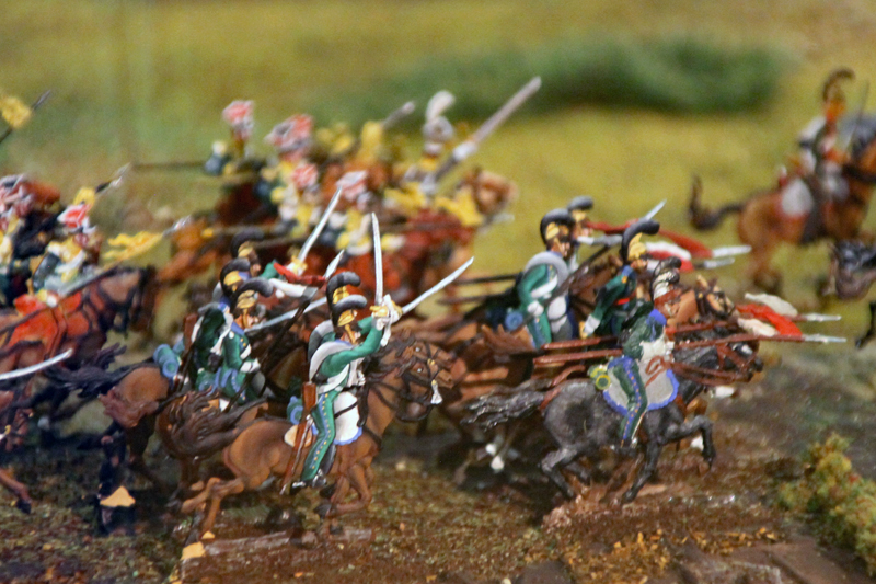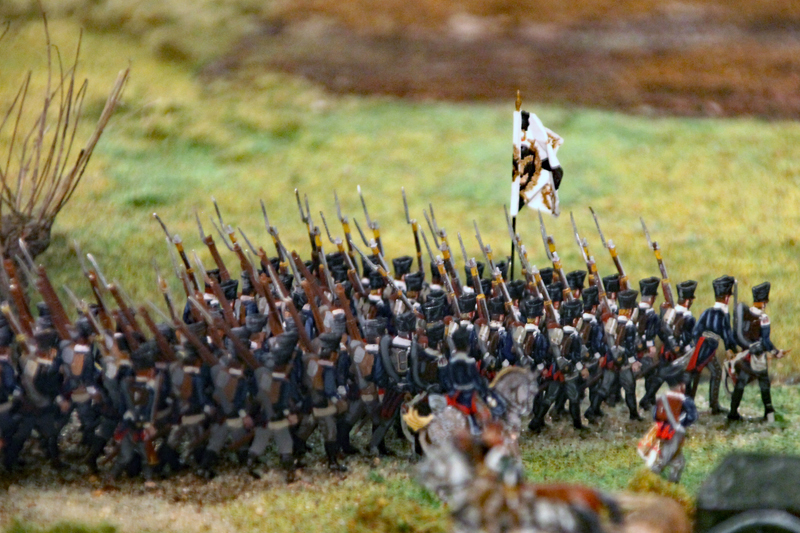 Auf dem rechten Flügel der Alliierten (nördlich der Brücke), hat das II. Bataillon des Pommerschen Infanterie-Regiments Karree formiert, um die Attacke eine kombinierten Kavallerie-Brigade aus 6., 7., 8. Husaren 1., 3., 5. 9. Lanciers, 16. Chasseurs abzuschlagen.