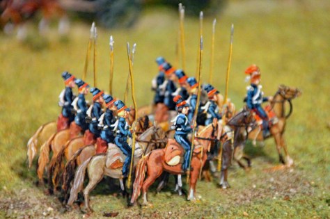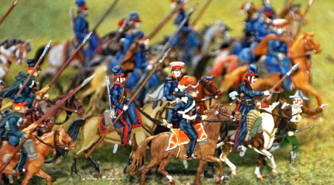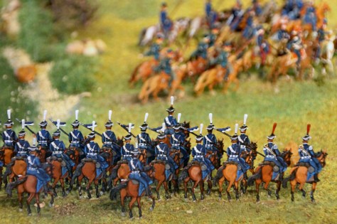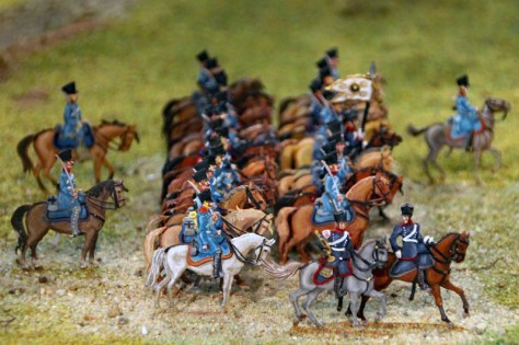 Russische und Preußische Kavallerie steht bereit die französischen Reiter der 1. Leichten Kavallerie Division abzufangen.