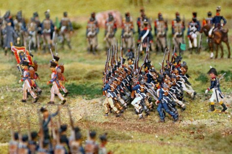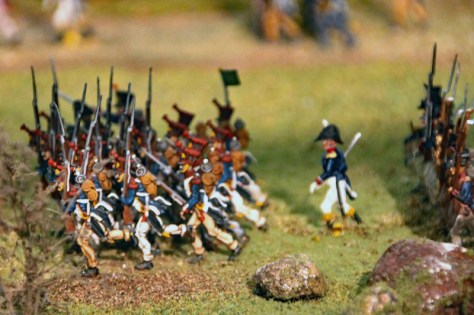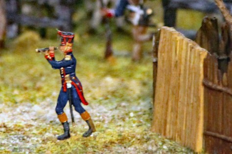 Am nördlichen Rand des Dorfes kämpfen die Grenadiere und Voltigeure 112. Linien-Regiments. Jeweils eine Kompanie der Neapolitaner und Franzosen marschiere auf der Dorfstraße zu ihren Einsätzen.