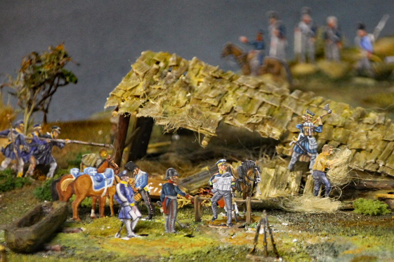 Pioniere fällen Bäume und Busche rund um den Brückenkopf (Diorama „Ausstellung 1813“).