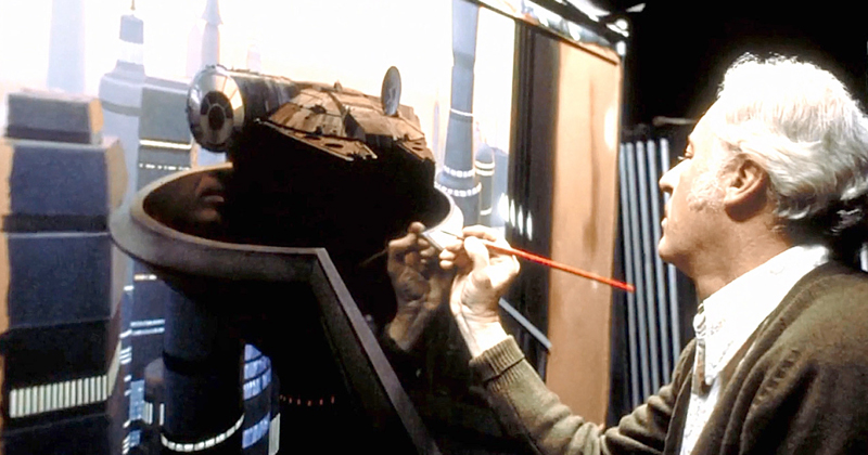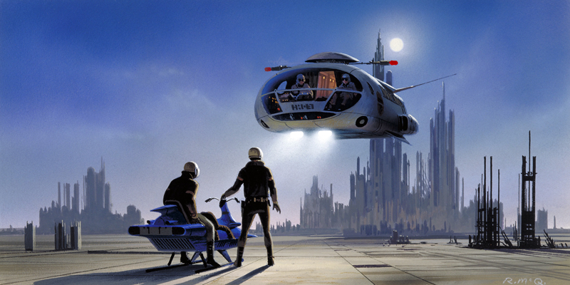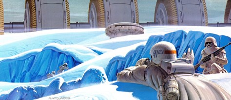 Doch nun zurück zu Ralph McQuarrie, dem visionärem Illustrator, der ohne Übertreibung als die kreative Kraft der ersten drei Star-Wars-Filmen bezeichnet werden kann. Seine Konzept-Zeichnungen und Designs haben den bis heute unverwechselbaren Star Wars – Look geschaffen. Neben seinen Entwürfen schuf McQuarrie auch einige sogenannte Matte Paintings für „Das Imperium schlägt zurück“ und „Die Rückkehr der Jedi-Ritter“. Bei diesen Matte Paintings handelt es sich um gemalte Teile von Kulissen in Filmsets, die auf Leinwand oder Glas aufgebracht wurden. Heutzutage werden solche künstlichen Kulissen natürlich digital erstellt.