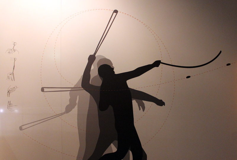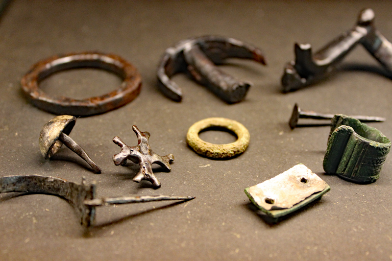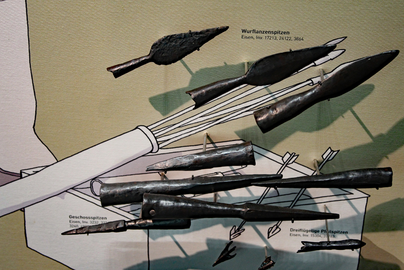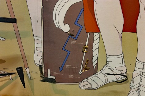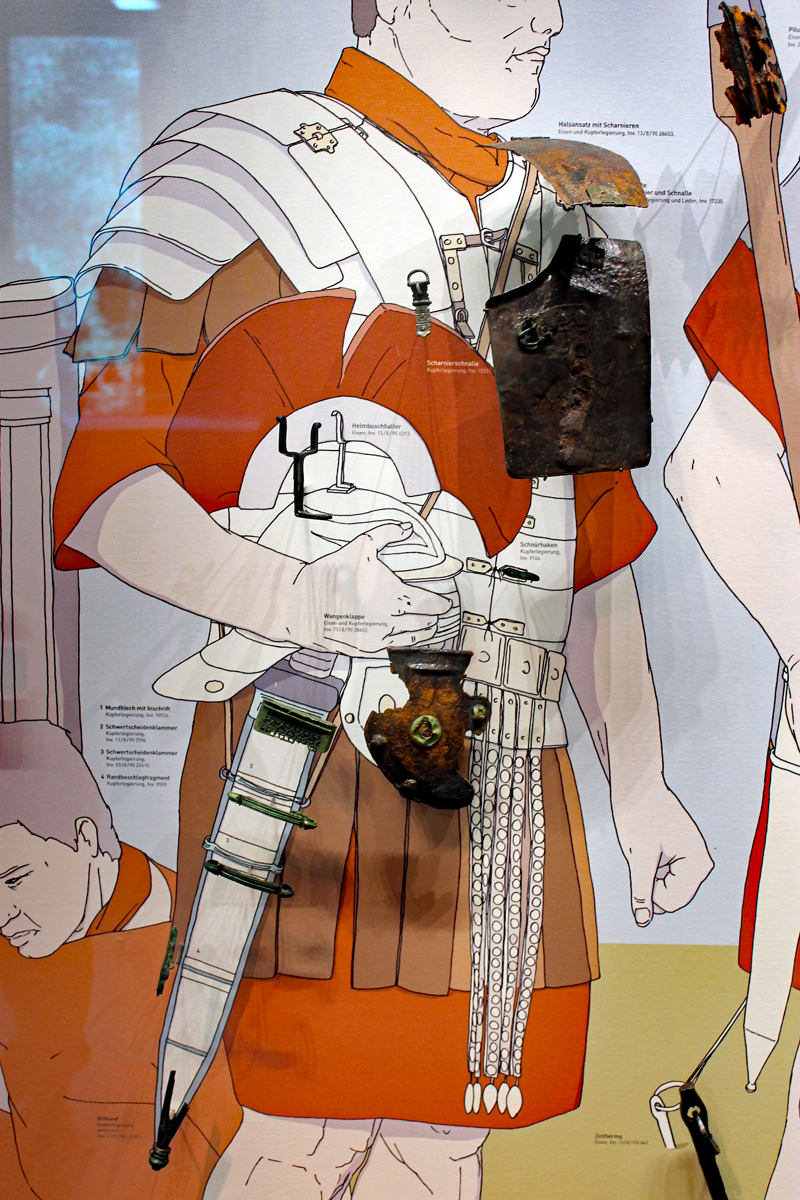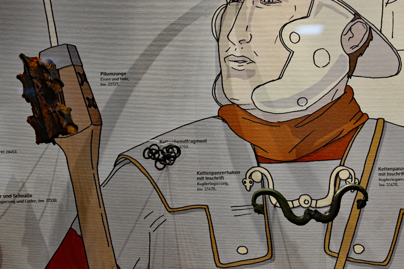 Funde von Waffen und Rüstungen kann der Besucher durch dahinterliegende Abbildungen den einzelnen Ausrüstungsteilen der Legionäre zuordnen.