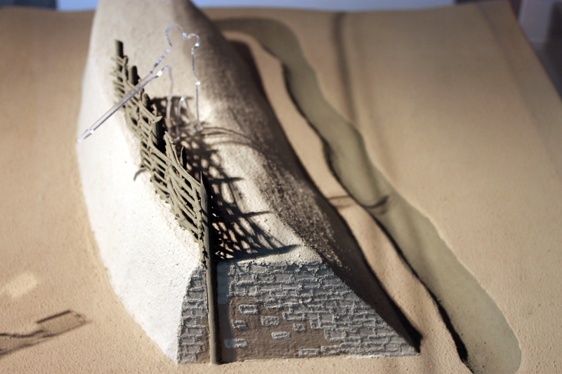 Mitten auf dem Schlachtfeld ist einer der wichtigsten Funde rekonstruiert. Es handelt sich um einen Wall, den die Germanen vermutlich am Fuß des Kalkrieser Berges angelegt hatten. Viele Hinweise sprechen dafür, dass die Germanen ihn nicht lange vor dem Eintreffen der römischen Soldaten aus Gras-Soden errichteten. Im Wall fand man Spuren von Holzpfosten. Sie stützten wohl eine Brustwehr aus Weidegeflecht. Hinter diesem Wall warteten die germanischen Krieger auf die römische Marschkolonne, die diesen Engpass zwischen Moor und dem Kalkrieser Berg passieren musste. Es gibt allerdings auch Vermutungen, die den Wall als Teil eines römischen Marschlagers sehen.