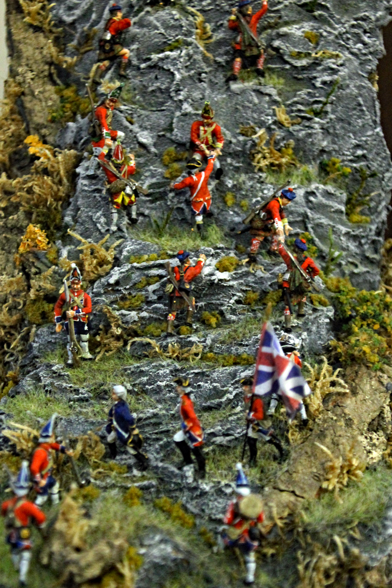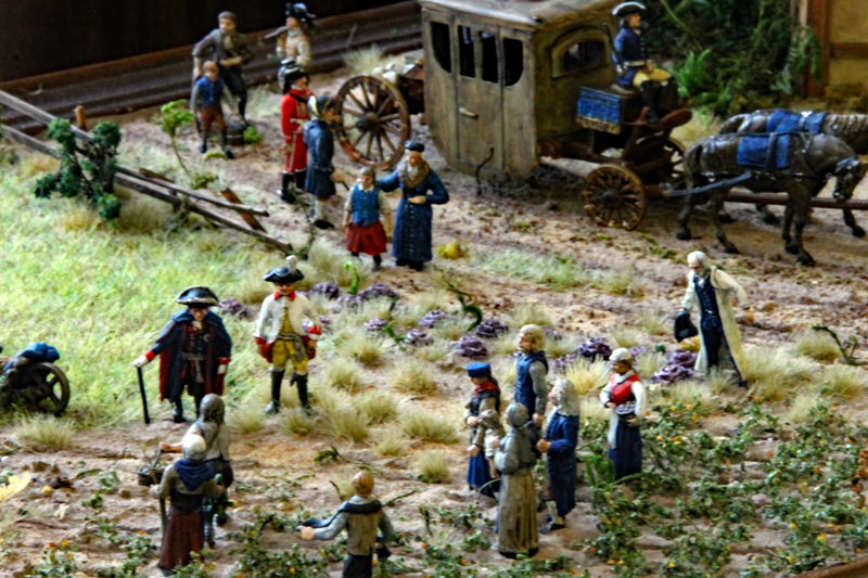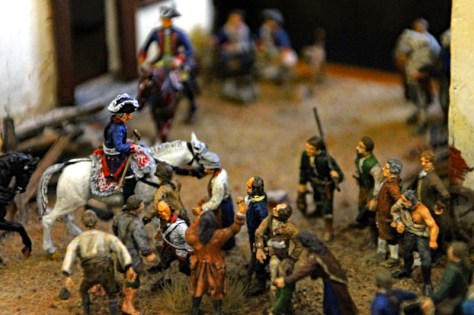 Beginnen wir mit Rüdiger Fischer und seinen Dioramen zum Thema 7-jähriger Krieg. Bei den meisten Dioramen handelt es sich um die Nachstellung berühmter Gemälde mit Figuren und Gelände. Nachdem Rüdiger nahezu alle bekannten Schlachtszenen gebaut hatte, gehen seine neuen Werke mehr und mehr in Richtung Zivil- und Gebäudedarstellung. Bemerkenswert ist nicht nur sein handwerkliche Geschickt, sondern auch die Ausdauer und Energie, mit denen er seit Jahren dieses Thema verfolgt.