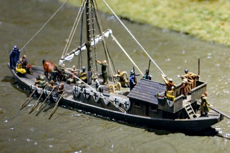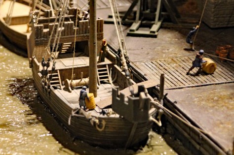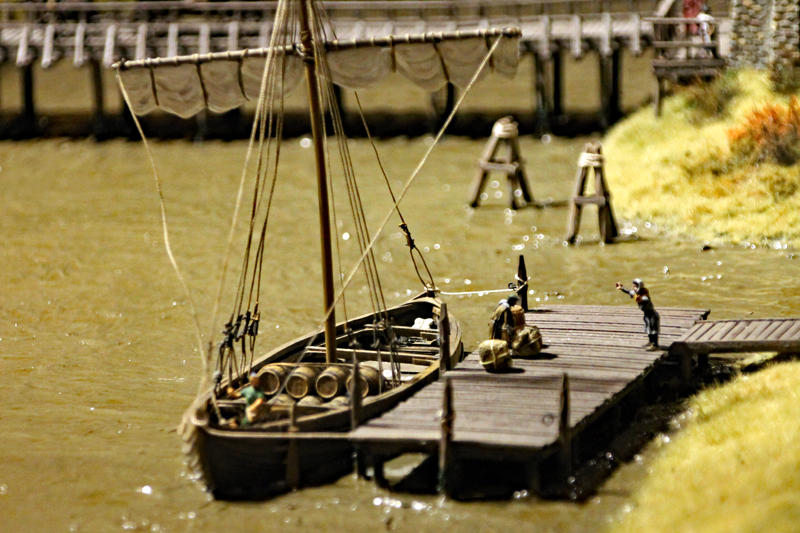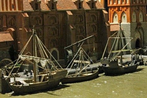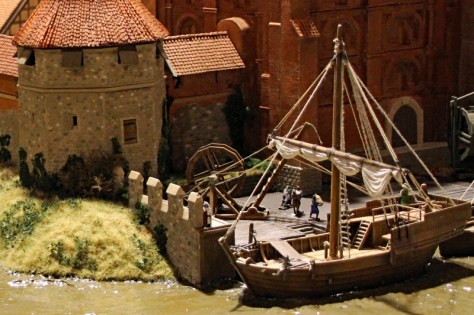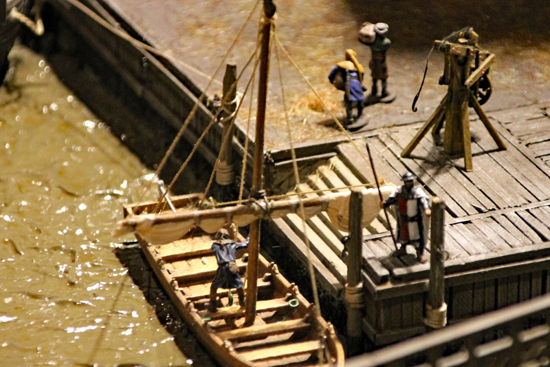Besonders gut hat mir das Treiben auf dem Fluss und im kleinen Hafen gefallen. Hier sieht man Flussboote die Ritter und ihre Gefolgsleute befördern und Hansekoggen die entladen werden. Vor einem riesigen Speicher stehen Kräne bereit, um die Waren von den Schiffen heben. Auf dem Fluss entdeckt man aber auch kleine Boote und Fischer.