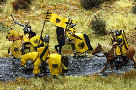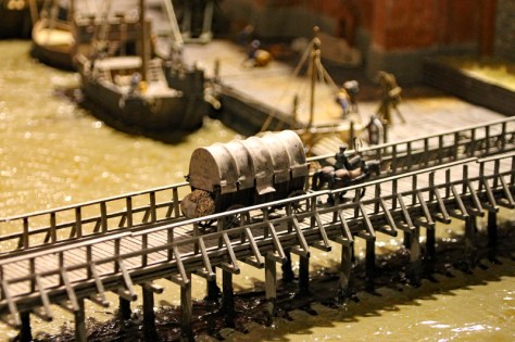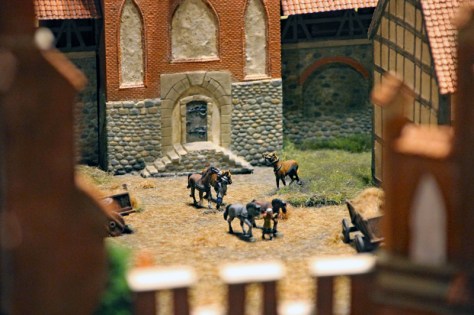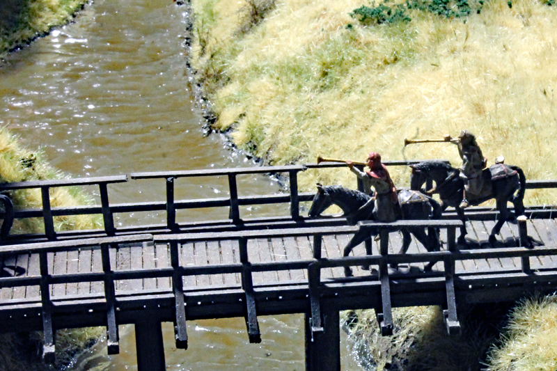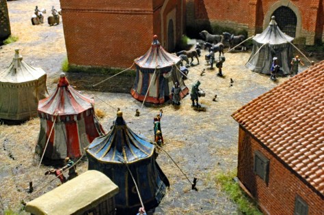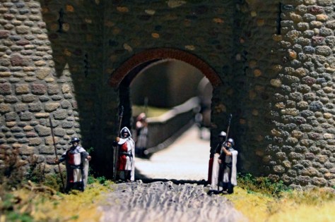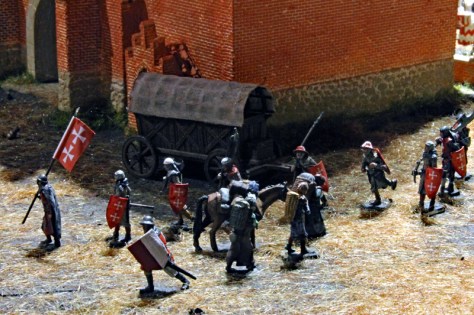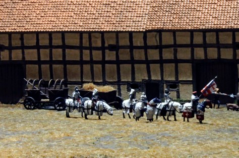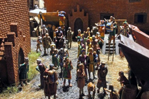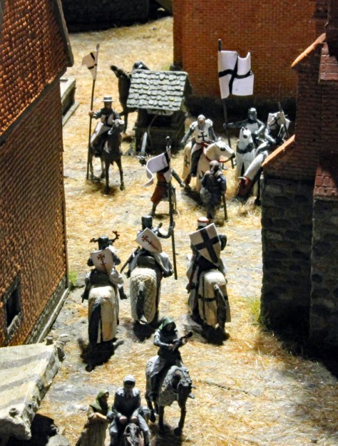 Das Diorama zeigt auch, wie König Johann von Böhmen in die Stadt kommt und immer neue Händler und Reisende auf die Tore zusteuern. Leider kann ich die Wappen nicht ohne Recherche zuordnen, aber neben den Ordensbrüdern des Deutschen Ordens sind auch die Gefolgsleute des Grafen von Neuenahr zu sehen.
