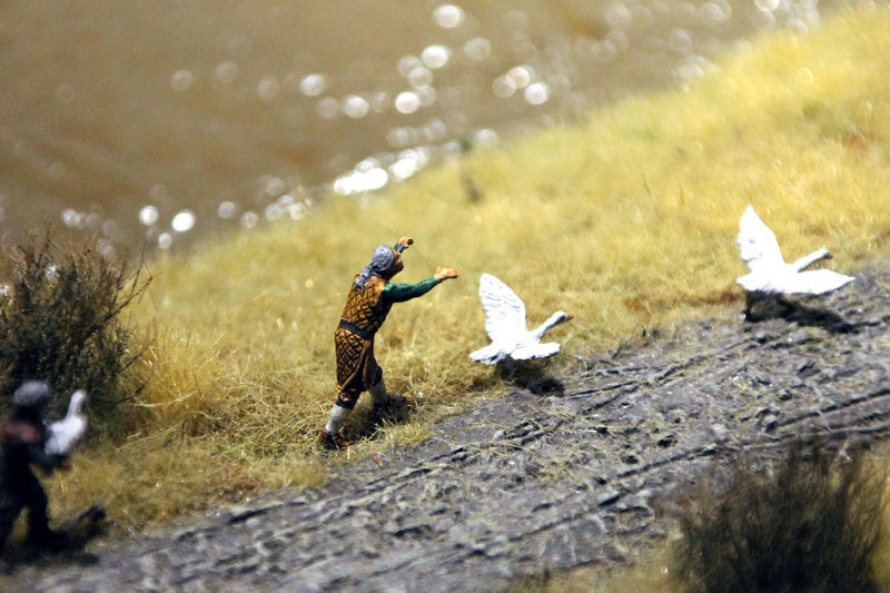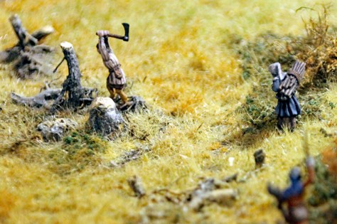 Jos Geurts aus den Niederlanden, der vor allem durch seine realistischen Drahtbäume berühmt geworden ist, hat das Gelände rund um die Burg gestaltet. Die offene Graslandschaft und das kleine Wäldchen auf der anderen Seite des Flusses sind wirklich Meisterwerke. Durch die sieben unterschiedlichen Grassorten, die kleinen Büsche sowie die Reisig- und Holzstapel sieht das Ganze nahezu fotorealistisch aus. Belebt wird die karge Landschaft durch Landbevölkerung beim Sammeln von Holz oder durch kleine Jagdszenen.