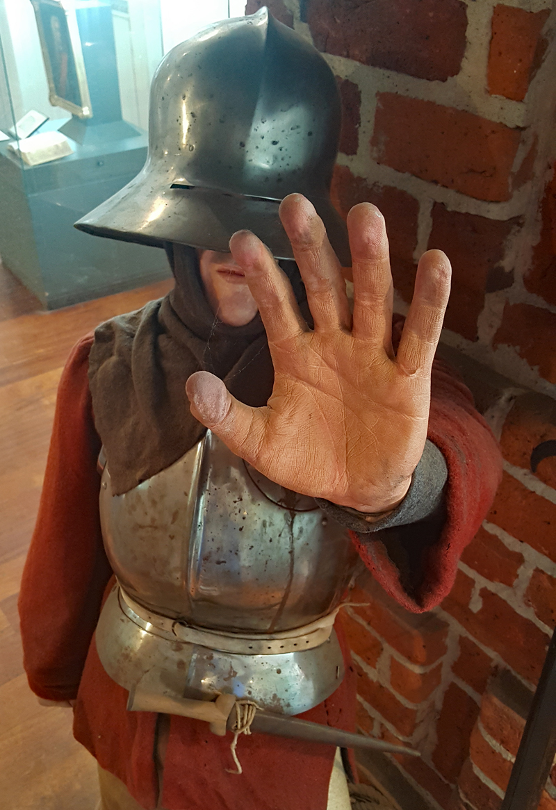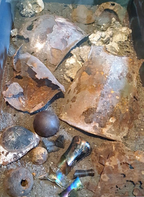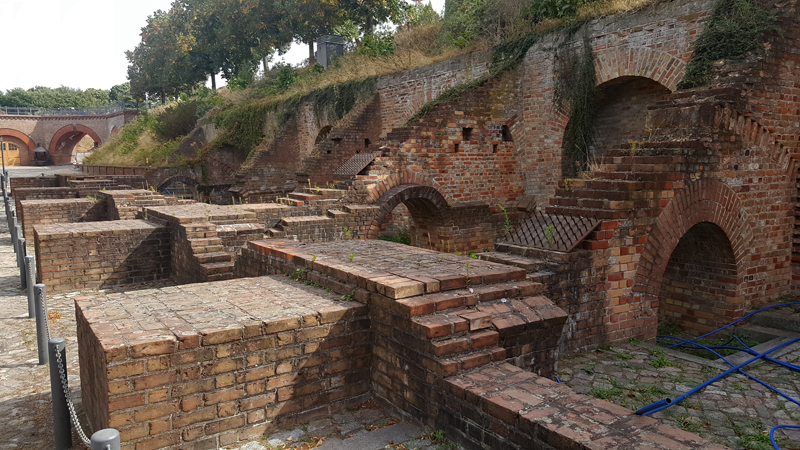 Während der Arbeiten an der Südkurtine der Zitadelle im Jahre 1970 stieß man auf die Reste des alten Magazins, das durch die Beschießung von 1813 zerstört worden war. Beim Ausheben des Brandschuttes fanden Archäologen neben ausgeglühten Werkzeugen, Kanonenkugeln, einigen Weinflaschen und zerbrochenem Geschirr auch die im Bild zu sehenden Brustpanzer. Es handelt sich um Rohlinge, die von der nahegelegenen Schmiede zur Festung geschafft worden sind. Hier wurden sie beschossen, um die Qualität des Panzers zu prüfen.
