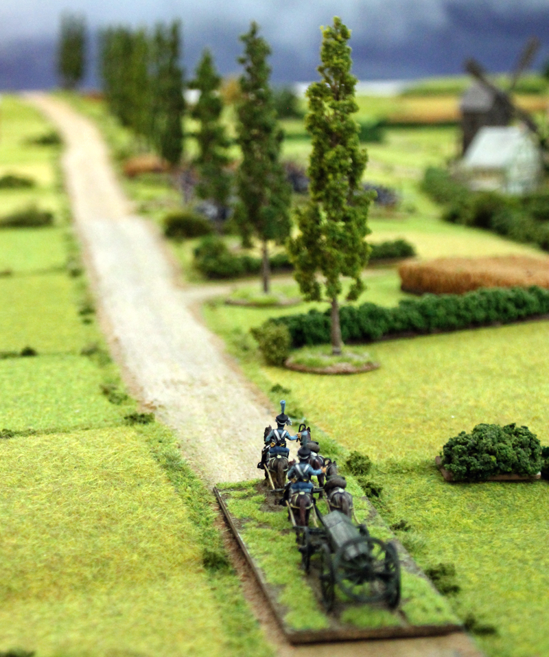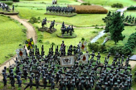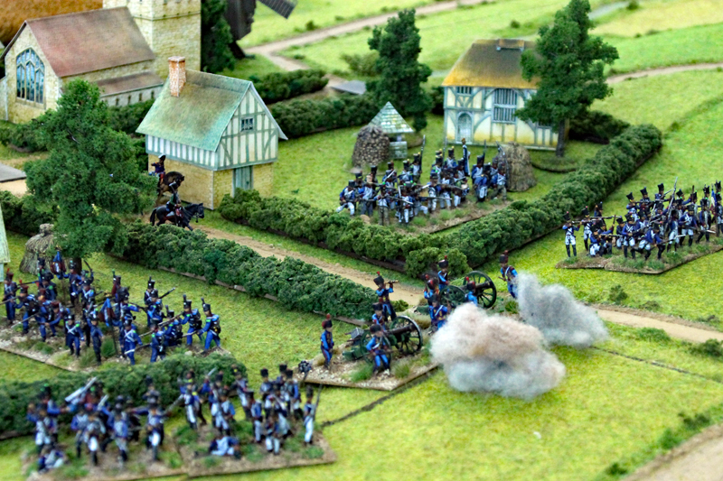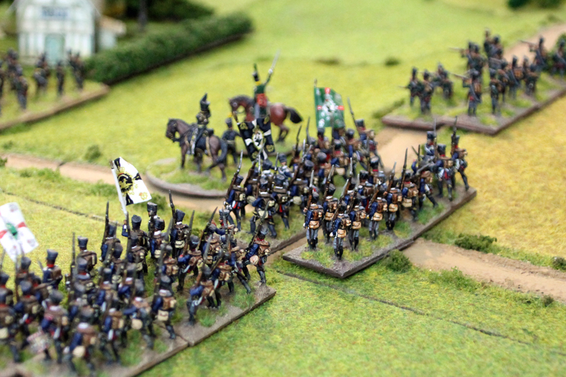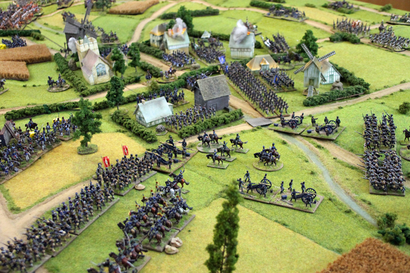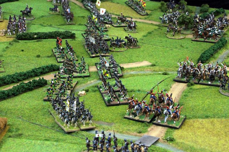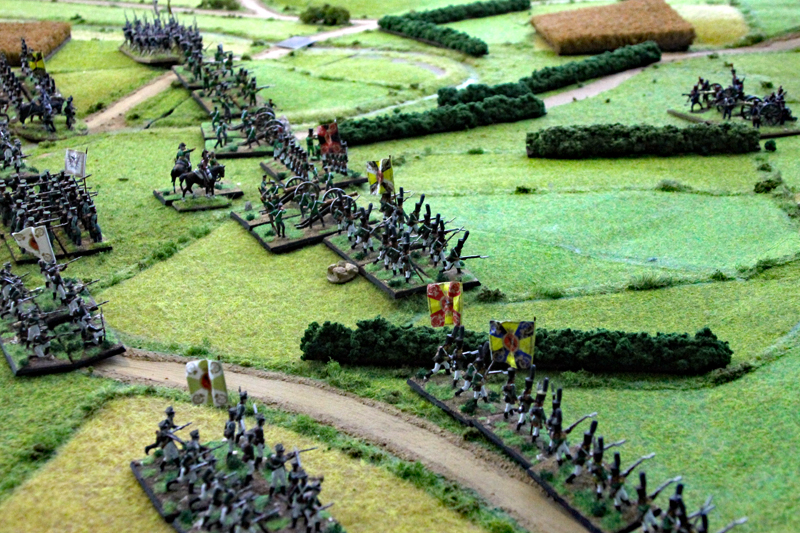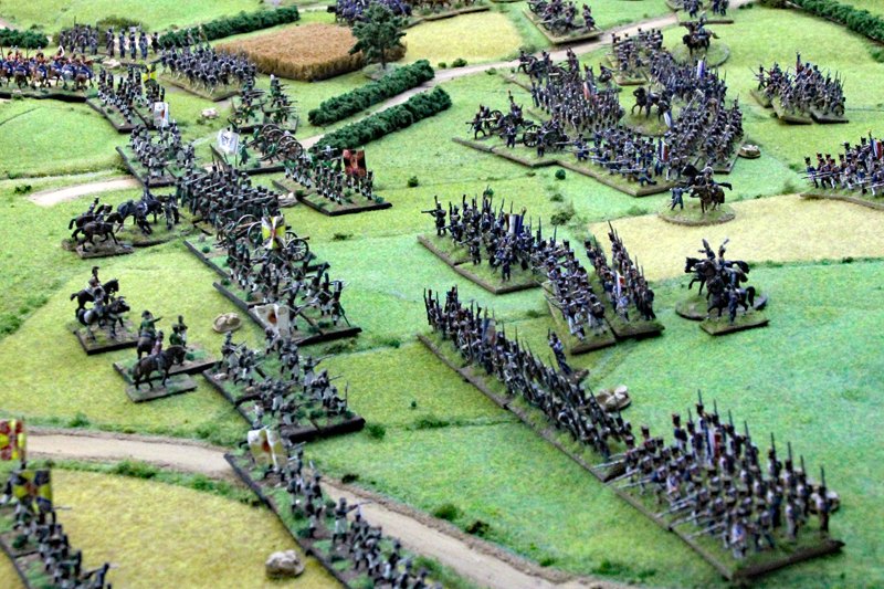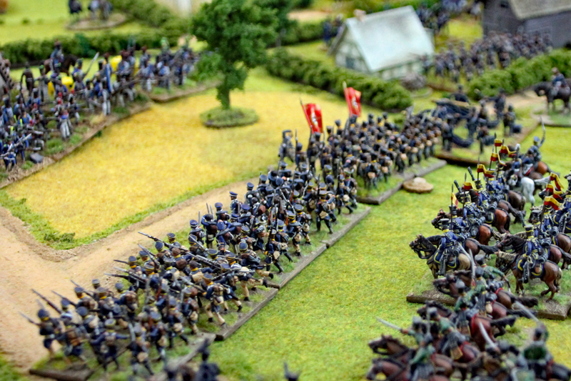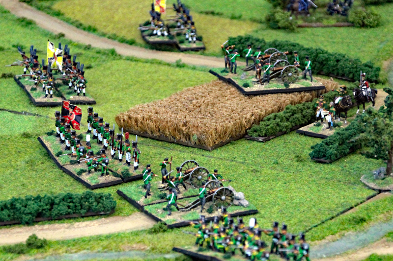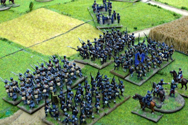 Wir begannen die Schlacht um 11.35 Uhr südlich der Dörfer mit einem Feuergefecht der ersten Linie der 1. Preußischen Division auf der einen Seite und mit den Truppen des Marschalls Ney auf der anderen Seite. Unterstützt wurde der Vormarsch der Preußen durch eine große russische Artillerie-Batterie, während die russische Infanterie in einer langen Linie aufmarschierte. In der 2 Runde näherten sich auf der rechten Flanke die Russen und Franzosen langsam auf Schussweite an. Auf der linken Flanke ging das Feuergefecht in die nächste Phase, während ein Regiment preußische Husaren die Dörfer im weiten Bogen umritt.