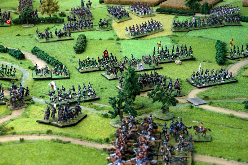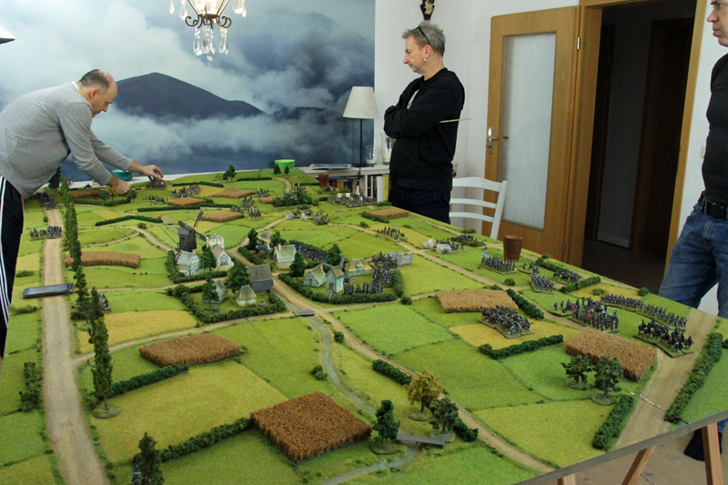 Ein super schöner Tag, es hat viel Spaß gemacht. Tatsächlich ging es viel mehr um Bewegung als um Nahkampf, aber es war gut auch so eine Gelegenheit zu bekommen um das zu testen. Leider waren die Ankommen-Punkte für den Rest der französische Armee ungünstig ausgewürfelt und das hat einfach Zeit gekostet um alle in die richtige Stelle zu bringen. Visuel aber war es wunderschön, besser gesagt -> die Kinderträume werden wahr! 🙂