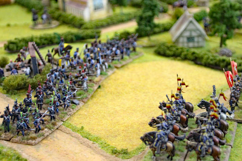 Ein weiteres preußisches Kavallerie-Regiment ritt rechts der Dörfer vorbei. Ziel der preußischen Kavallerie waren die sogenannten Kommunikationslinien der Franzosen. Dabei handelte es sich um 3 Punkte an der Leipziger Straße. Hielt man als Gegner 2 dieser 3 Punkte (diese Kommunikationslinien gab es natürlich auch auf alliierter Seite), so hätte dies schwere Folgen für die Moral der Franzosen. Auf der rechten Flanke war mittlerweile die zweite Division als zweites Treffen hinter die 1. Division der Russen gerückt. Aber auch die Franzosen konnten sich auf dieser Seite des Schlachtfeldes langsam in Position bringen.
