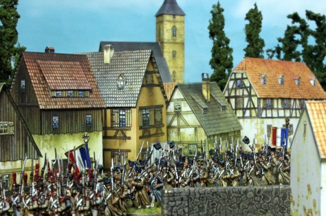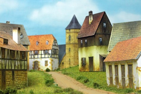 Spielt man das Regelwerk Field of Glory Napoleonics im Maßstab 1/72, dann entspricht 1 cm auf dem Spielfeld ungefähr 10 Meter auf dem Original-Schlachtfeld. Will man ein Dorf mit mehreren Gebäuden darstellen, so darf die gesamte Ortschaft nicht viel größer als 20 x 20 cm werden (also rund 200 x 200 Meter im Original). Damit wäre beispielsweise die Grundfläche eines Bauernhauses nicht größer als rund 6 x 3 cm. Die Papiergebäude aus dem Buch „European Buildings“ entsprechen genau diesen Anforderungen und sind außerdem sehr schön gezeichnet und konstruiert.