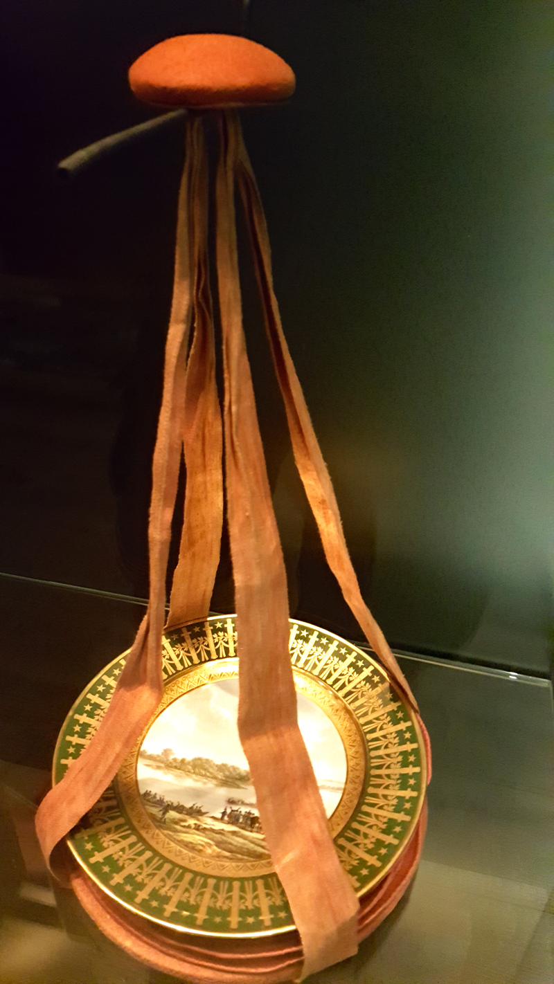 Auf dem Feldzug verwendete Napoleon einfaches Silbergeschirr von Biennais. Martin-Guillaume Biennais war ein bekannter Pariser Gold- und Silberschmied, der seit 1789 ein Geschäft in der rue Saint-Honore hatte. Biennais war neben Thomire und Jean Baptiste Claude Odiot einer der berühmtesten Empire-Goldschmiede in Paris. Napoleon Bonaparte ernannte ihn nach seiner Kaiserkrönung zum königlichen Goldschmied. Es gab zwei verschiedene Teller-Versionen, eine mit einem einfachen Rand und eine, wie bei diesem Teller, mit einem Palmetto-Rand, welcher für ausgewählte Gäste vorgesehen war. Der schwach sichtbare Schriftzug „Waterloo“ wurde natürlich später eingraviert. Bei diesem Teller handelt es sich um ein Beutestück der Preußen aus Napoleons Kutsche.
