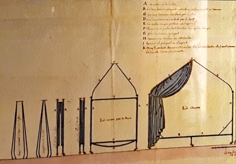 Faltbett-Hülle – Die verlängerte Basis des Bettes, von Desouches verbessert, ist ein wichtiger Bestandteil der Erfindung. Sie ersetzte die herkömmlichen Lederriemen, die der Erfinder als unkomfortable und zu geruchsintensiv empfand. Das Segeltuch, aus dem die Basis des Bettes gemacht ist, wurde mit dem Bettgestell durch Metallhaken verbunden.