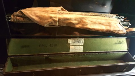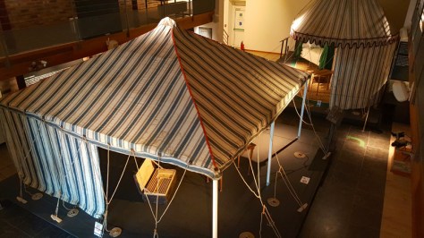 Es gibt nur noch zwei in Teilen erhaltene Zelte dieses Typs, von denen hier in der Ausstellung das Dach und eine Außenwand zu sehen sind. Man erkennt eine Schlamm-Barriere am unteren Rand des Zelts, welche das Eindringen von Staub und Schlamm verhindern sollte. Das Dach und die Wände wurden durch Klammern miteinander verbunden. Das Zeltgestell ist eine Reproduktion und besaß im Original eine zentrale Stange.