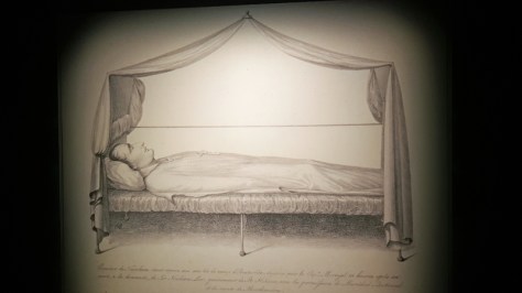 Diese Bild zeigt Napoleon in seinem Bett aus Austerlitz, 15 Stunden nach seinem Tod am 5. Mai 1821. Napoleon besaß zahlreich Faltbetten, die alle ständig in seinen Palästen in Gebrauch waren, wie beispielsweise jenes, dass im Schlafzimmer des Schlosses Fontainebleau stand. Eines der Betten nahm er mit in sein Exil auf die Insel St. Helena. Er starb sogar in diesem Bett. Die eisernen Desouches-Betten erlangten ohne Zweifel vor allem durch dieses Bild, dass den Kaiser im Leichentuch wenige Stunden nach seinem Tod zeigt, große Berühmtheit.