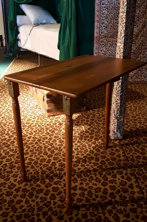 Dieser transportable Tisch hat ein geniales Design. Seine drei Beine und drei Tischplatten lassen sich durch Scharniere zu einem Rechteck von wenigen Zentimetern Höhe zusammenklappen und in einer mit Leder verstärken Segeltuchhülle verstauen. Außerdem kann der Tisch durch Metallhaken mit weiteren identischen Tischen verbunden werden und so je nach Bedarf eine kleinere oder größere Tischfläche bilden. Obwohl dieser Tisch schon häufig als einer von Napoleons Möbel ausgestellt wurde, stammt dieser vermutlich eher aus den 1830er Jahren, da bisher kein Auftrag für die Herstellung eines solchen Tische gefunden wurde.