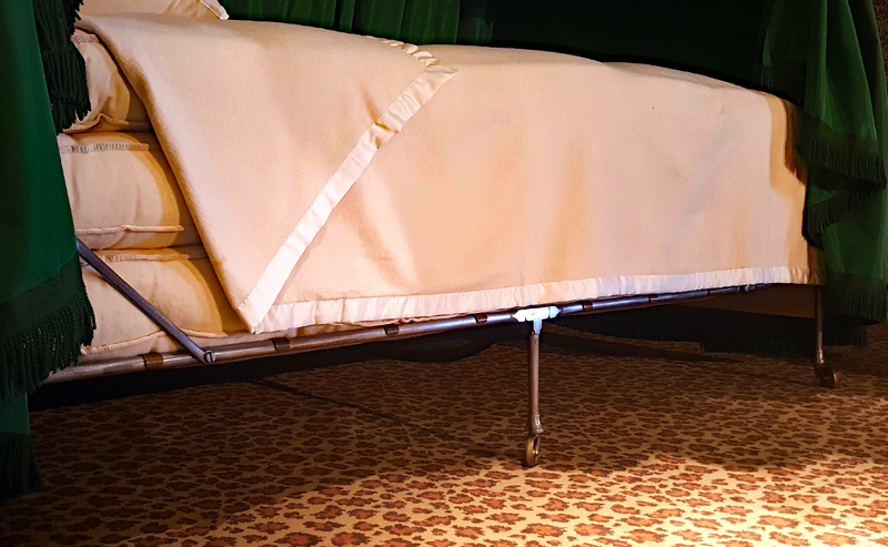 Faltbares Feldbett – Es war ein Nachfahre von Marie-Jean Desouches, dem Schlosser Napoleons, der diese X-förmige Bett in den Jahren 1835-1839 fertigte. Diese Form wurde im 19. Jahrhundert allgemein üblich und ist bis heute noch die traditionelle Form für eine Feldbett. Die Basis, ein Segeltuch dekoriert mit geometrischen Motiven, ist an ein Bettgestell genäht. Die gesamte Konstruktion kann zusammengefaltet und in einer Transport-Schachtel aufbewahrt werden. Schmaler als Napoleons Bett und weniger filigran gefertigt, ist diese Modell jedoch leichter. Es ist bemalt, vermutlich um das Metall vor Rost zu schützen. Das Ganze wurde für einen der Söhne Louis-Phillipe’s gefertigt, der an der Eroberung Algeriens in den Jahren 1830 bis 1847 teilnahm.