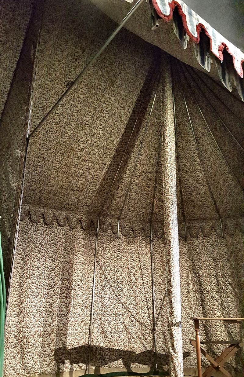Das hier gezeigte Zelt wurde an das Möbel-Depot im Jahr 1835 ausgeliefert und gleicht dem, mit welchem der imperiale Haushalt für die Spanien-Feldzug im Jahr 1808 ausgestattet worden war. Es bestand aus einem Dach, genannt „Corps“, und vier Außenwänden sowie inneren Vorhängen, welche das Zelt in einen Schlafraum, einen Arbeitsraum sowie einen Waschraum unterteilten. Die Außenseite des Zeltes besteht aus einem Material mit Namen „coutil“, dass aus sehr robustem Segeltuch gewebt wurde.