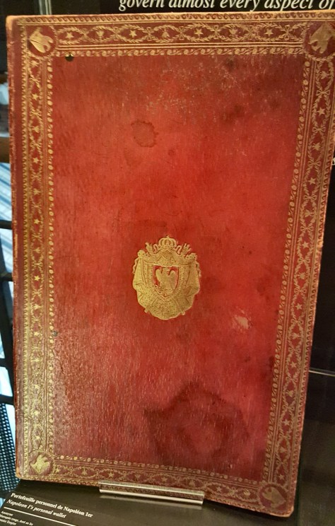 Napoleons persönliche Schreibmappe – Die vorgefertigten Dokumente und Briefe, die noch die Unterschrift des Kaisers benötigten, wurden Napoleon in diese Schreibmappe, welche das kaiserliche Wappen zeigt, vorgelegt.