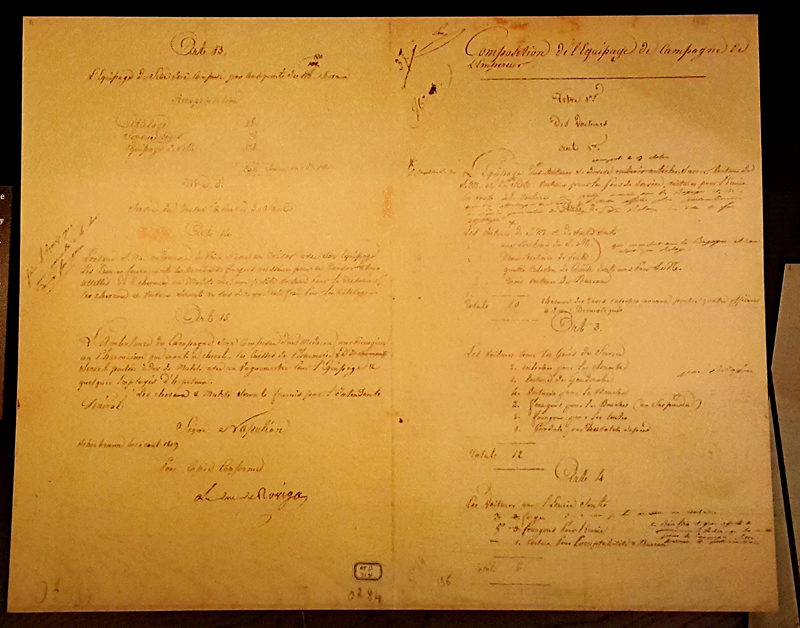 Im Jahr 1812, in Vorbereitung auf den Russlandfeldzug, wurde der kaiserliche Tross für das Gepäck Napoleons in vier Abteilungen gegliedert. Dies waren der Service lèger, der Service d’expèdition, der Gros bagages und der Èquipages de selle. Im Waterloo-Feldzug von 1815 bestand der Service d’expèdition, der kaiserliche Wagentrain im Feld, aus 14 Wagen für den Stab und die Diener. Der schweren und leichten Gepäck-Train, der sogenannte Gros bagages und Service lèger, setzte sich zum einen aus 24 Wagen mit 240 Pferden und zum anderen aus einer Kolonne von 76 Maultieren und Pferden zusammen. Im Èquipages de selle wurden die Ersatztiere mitgeführt, welche zu 10 Brigaden mit je 13 Pferden an lang der Reise-Route des Kaisers bereitstanden und von einem Offizier und 20 reitenden Chasseurs der Garde gesichert wurden. Das Gepäck Napoleons bestand aus Zelten, Betten, Verpflegung und sonstigen Feldlager-Gebrauchsgegenständen.