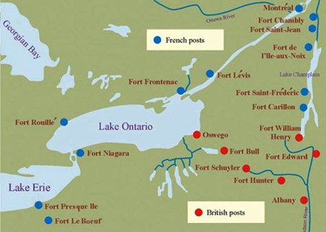 auf einer Insel im Norden des Lake Champlain. An einer Engstelle des Lake Champlain stand das französische Fort Saint-Frédéric (später Crown Point) und am Nordende von Lake George das Fort Carillon, besser unter dem Namen Ticonderoga bekannt. Am Südende des Lake George begann das Gebiet von Neu-England und wurde hier ab 1755 durch das Fort William Henry gesichert.