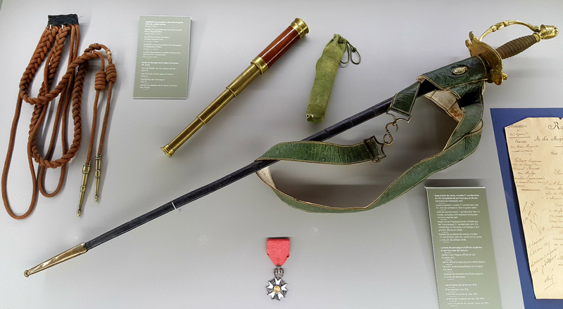 In dieser Vitrine sind Gegenständen, wie die Fangschnur einer Uniform, ein Kreuz der Ehrenlegion, ein Fernglas eines Staboffiziers und der Degen eines Flügeladjutanten, dieser Männer zu sehen.