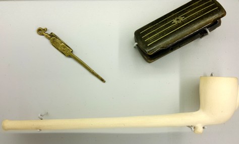 Der Pfeifenreiniger gehörte dem Soldaten Cantiniaux aus Fleurus. Die Tabaksdose ist aus Ebenholz, der Deckel mit Silber verziert.