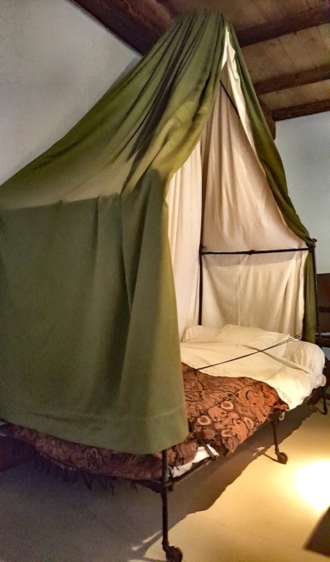 Das berühmte Klappbett Napoleons bestand aus 4 Stangen, welche die Vorhänge trugen. Kleine Kupferrohe dienen als Verbindungen, welche die Stangen mit dem Untergestell verbanden, welches wie ein Regenschirm zusammengeklappt werden konnte. Das Bett ist eine Leihgabe des Musée de l’Armée de Paris.