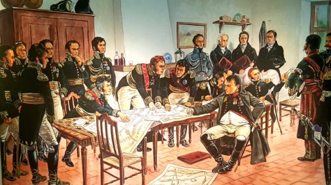 Nach dem Essen werden die Tische abgeräumt und Napoleon und sein Stab versammeln sich zur Lagebesprechung um die Tafel. Das Bild zeigt Napoleon umgeben von den Generälen Flahaut, La Bèdoyere, Milhaut, Reille, Drouot, Bertrand, den Marschällen Soult und Ney, den Prinzen Jerome, Colonel Gourgaud, den Minister Maret, den Baron Fain, sowie verschiedene Stabsoffiziere und Adjutanten.