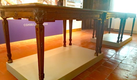 Das nächste Zimmer diente als Speise- und Arbeitszimmer. Vor dem Kamin hatte man drei identische Tische zu einer großen Tafel zusammengestellt und mit einem Teppich abgedeckt. Sowohl die drei Tische, als auch ein Teil des Teppichs sind noch im Original erhalten. Am 18. Juni 1815 nimmt Napoleon hier um 8 Uhr mit Jerome und zwei Adjutanten das Frühstück ein.