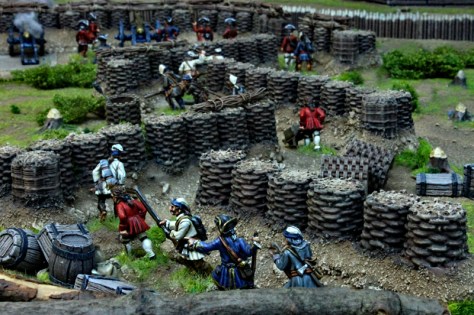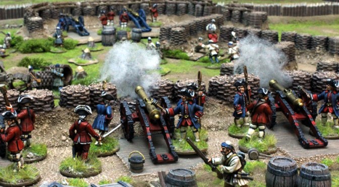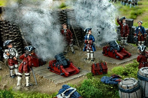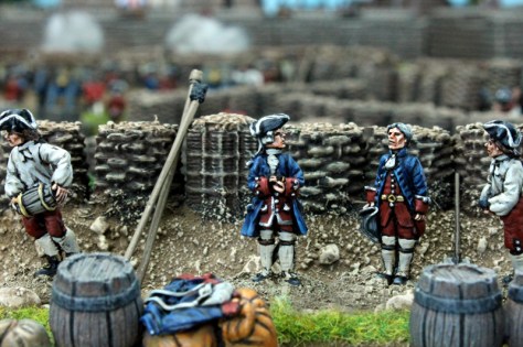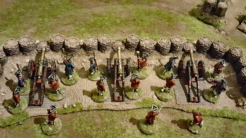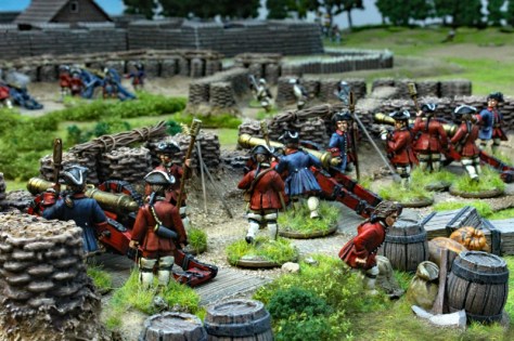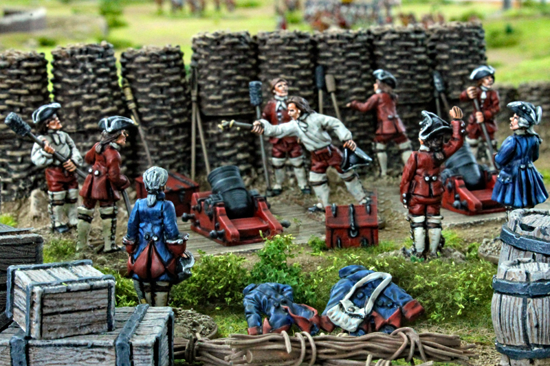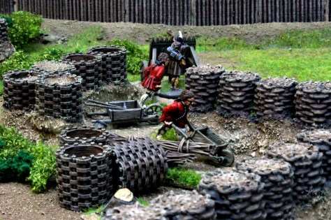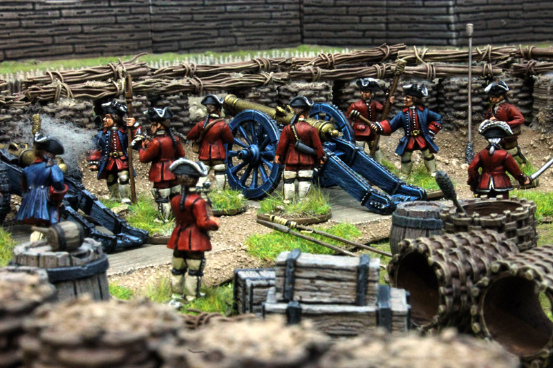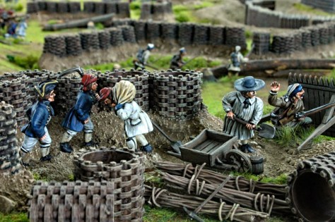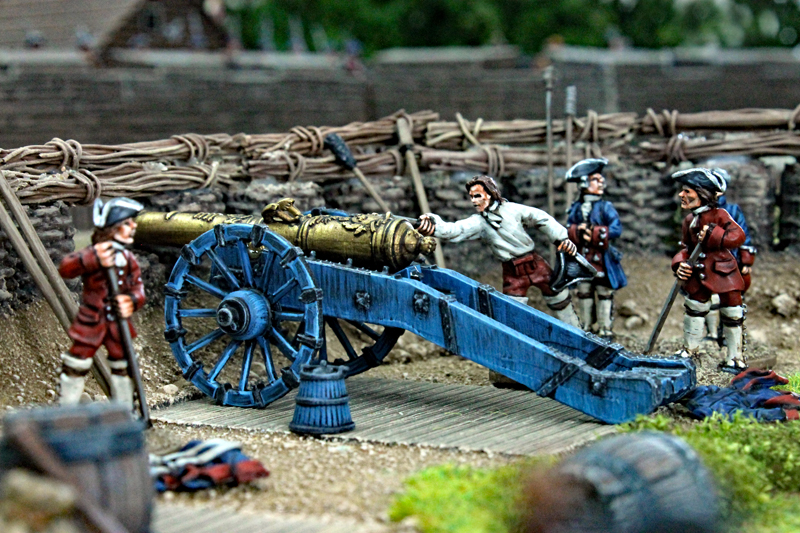 In der zweiten Parallele stehen zwei schwere Belagerungsgeschütze. Das eine Geschütz ist ein 18-Pfünder von Front Rank und das andere eine 24-Pfünder von Black Hussar. Auch hier sind die Schanzkörbe noch mit zwei Lagen Faschinenbündeln erhöht worden. Es gibt auch hier wieder einiges an Zubehör, wie Fässer von Pardulon und Gerätschaften von Black Hussar. In den Bildern sind neben den Sash and Saber Figuren, auch Miniaturen von Black Hussar zu sehen.