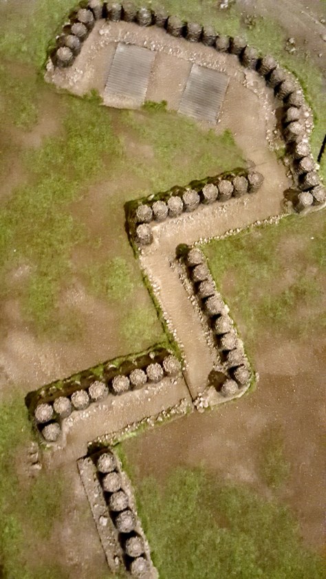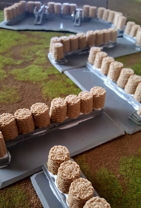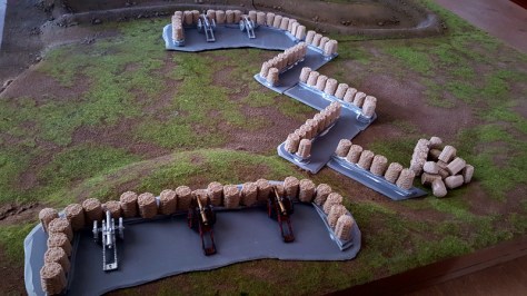 Zunächst habe ich das Fort auf der Landseite in jede Richtung um eine Plattentiefe erweitert, so dass ein U rundherum entstanden ist. Wie auf dem Originalschlachtfeld, habe ich auf der östlichen Seite einen Flusslauf eingearbeitet. Die Platten sind bisher nur grob bemalt und mit der erste Lage Grasstreu begrünt worden. Es fehlt jetzt noch die Gestaltung des Flusses und ein wenig Variation in der Begrünung. Zunächst habe ich aber Zeit und Energie in die Belagerungsanlagen der Franzosen gesteckt. Der Platz für Gräben und Batterien ist leider etwas begrenzt und aus diesem Grund musste ich die zwei geplanten Parallelen mit den Geschützstellungen etwas dichter an die Festung heranführen. Die Anlage sollte aber auf jeden Fall alle Elemente einer formellen Belagerung dieser Zeit enthalten. Hier erst einmal ein paar Bilder, die den Bau der Geländeteile zeigen…